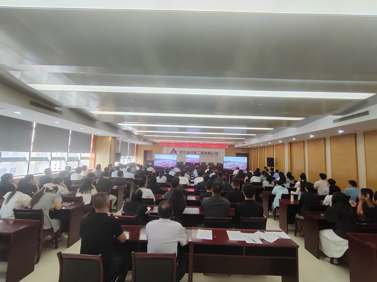 2025年9月3日,為紀念中國人民抗日戰(zhàn)爭暨世界反法西斯戰(zhàn)爭勝利80周年,河北省安裝工程有限公司積極組織職工集中觀看閱兵盛況直播。公司機關及各分公司、項目部共計2000余人通過多種方式同步參與,共同回顧歷史、緬懷先烈、展望未來。上午9時,習近平總書記發(fā)表重要講話,9時19分大閱兵正式開始,公司機關及各分公司、項目部會議室座無虛席,職工們們整齊地坐在屏幕前,神情莊重地注視著電視畫面。在閱兵式過程中,